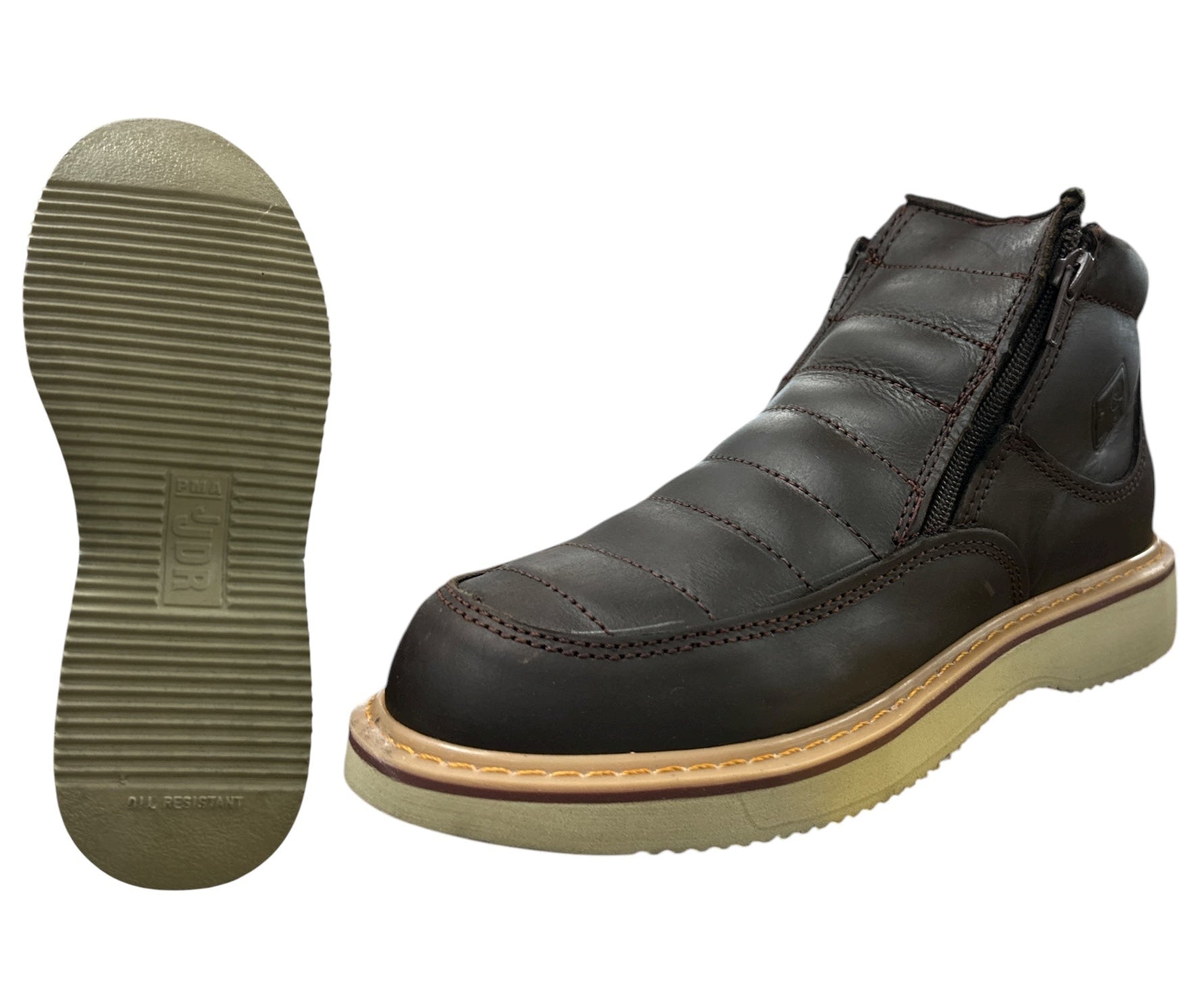 Introducing the 570 Crazy Cafe - the ultimate work shoe for the new age! With a double zipper for easy wear and a slip and oil resistant sole, you can stay comfortable and safe all day long. Say goodbye to tired feet and hello to productivity with this must-have shoe!